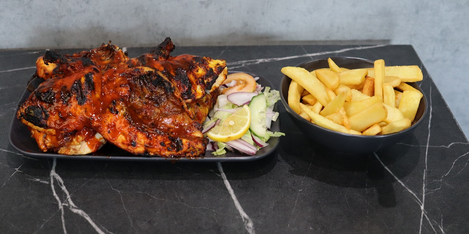 ½ Piri Piri Chicken, Chips or Nan or Rice served with Fresh Salad